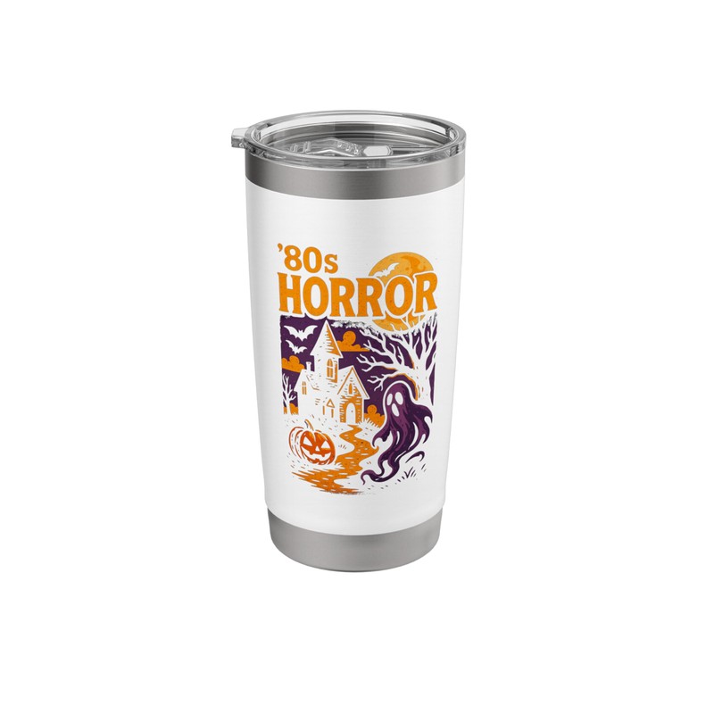 - Retro spooky scene with house, ghost and pumpkin. Contains the phrase Eighties horror for fans of classic fright. Nice grafic for Fans of lantern-lit nights, friendly frights and crisp autumn air with the title: Eighties Horror Retro Scene.
