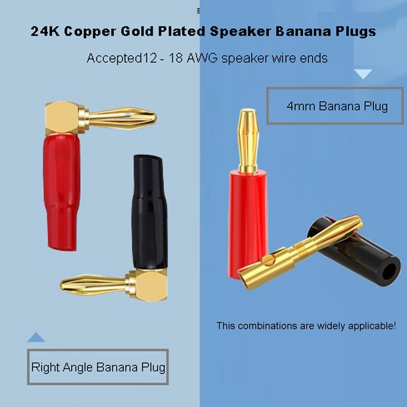 - Speaker Plugs Connector for Wide Application: Come with 4pcs banana plugs and 4pcs right angle banana plugs (provide an additional a flat screwdriver as a tool). Matching combinations are suitable for different scenarios and places. The 4mm banana plug is widely used and perfect for speaker wire installation. The 90 degree shape made it perfect for limited space.