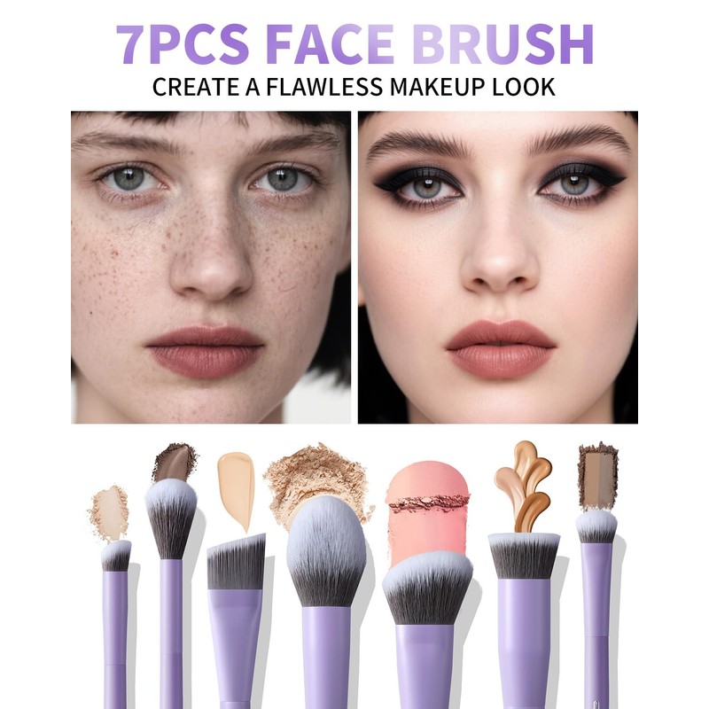 - 𝟳-𝗣𝗶𝗲𝗰𝗲 𝗘𝘀𝘀𝗲𝗻𝘁𝗶𝗮𝗹 𝗙𝗮𝗰𝗲 𝗕𝗿𝘂𝘀𝗵𝗲𝘀 𝗳𝗼𝗿 𝗙𝗹𝗮𝘄𝗹𝗲𝘀𝘀 𝗕𝗮𝘀𝗲: Achieve a naturally perfected complexion with 7 pro-crafted face brushes tailored for flawless blending of foundation, blush, concealer, nose shadow, highlight, and setting powder. Designed to sculpt, smooth, and enhance—your base makeup has never looked this effortless or refined.