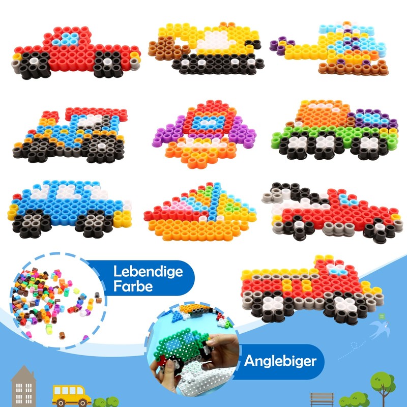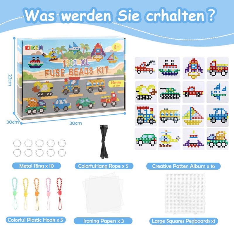 - 10 mm ironing beads set: 1500 pieces large ironing beads (10 mm maxi) in 16 colours, 16 vehicle theme patterns (1:1 in original size), 1 ironing beads plates, 3 ironing paper, 5 lanyards, 5 light buckles, 5 bands, 10 iron rings and 1 gift box. This ironing beads set contains other quantities and colours to choose from. XXL large beads a great gift for boys and girls who like to craft