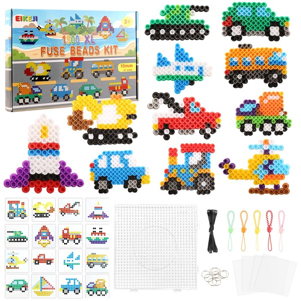 EIKEJI Large 10 mm Ironing Beads Vehicle Set, 1500 Pieces XL Beads with Plates, 16 Colours Maxi Ironing Beads, 16 Patterns and Ironing Paper, XL Ironing Beads, Creative Bead Set for Children from 3