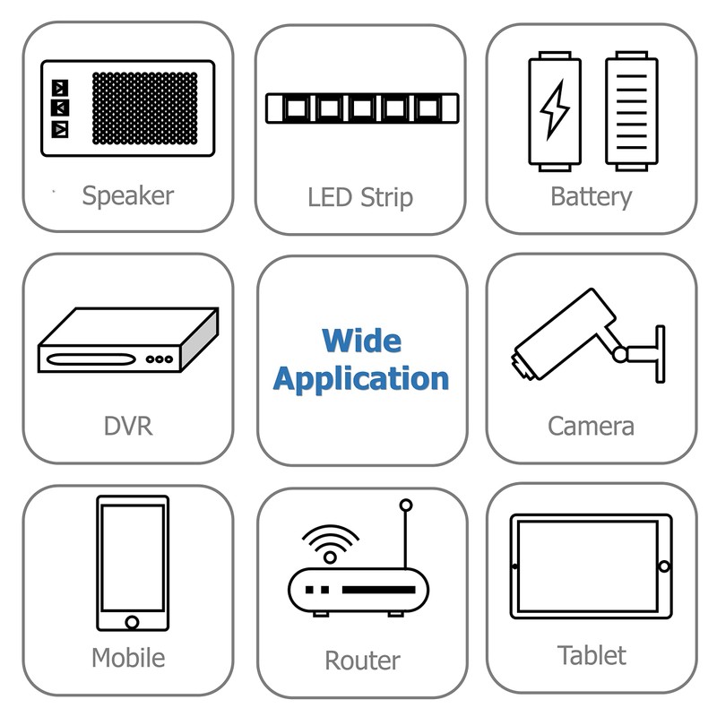 - [Wide Applictaion] Suitable for DC 9V digital electronics like Led Strip, String Lights, Wireless Router, LCD, Hub, Switches, CCTV Cameras, Android TV Box, Bluetooth speaker, etc.