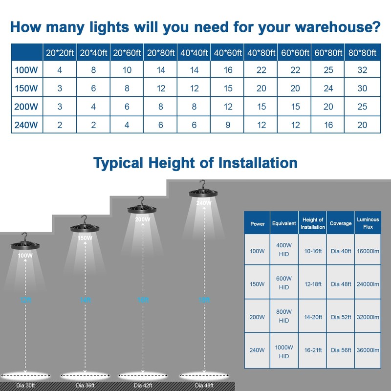 • Easy to install: This UFO LED high bay light features a ceiling mounted design and can be easily installed in garages, workshops, warehouses, barns, shops, or any other space in just 3 minutes.