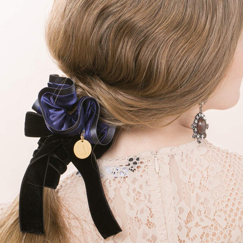 EILY ILY [Floral Gift Box Included] Bi-Color Satin Scrunchie (Royal Navy) with Initial Charm Gold Plate, Polyester Silver