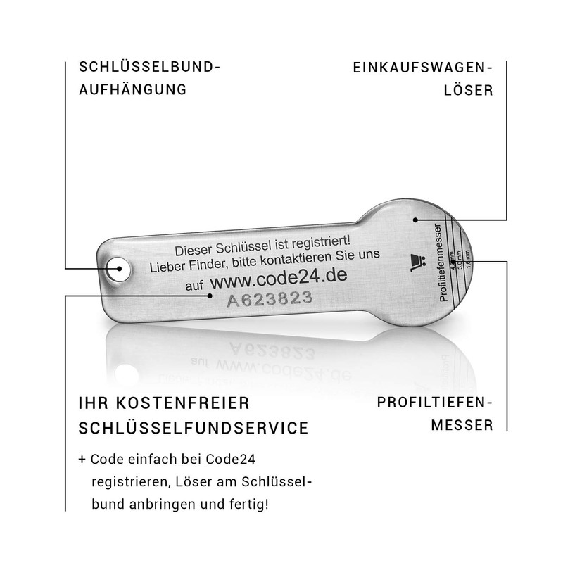 - Features: Our shopping trolley token keyring is also equipped with a tread depth gauge. So vehicle tyres can be checked at any time to always be safe on the go.