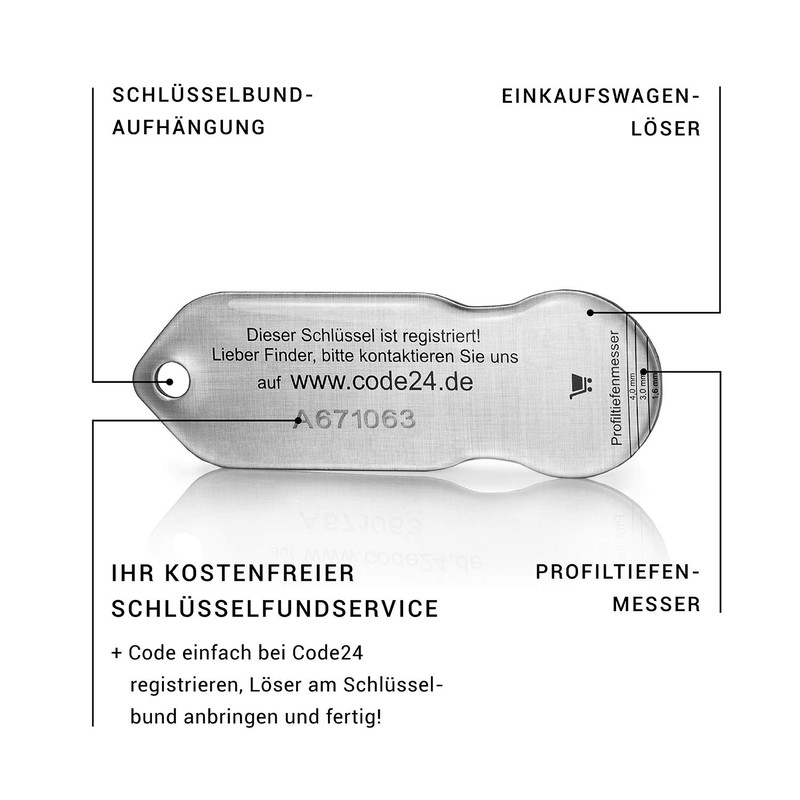 • Features: Our shopping trolley token keyring is also equipped with a tread depth gauge. So vehicle tyres can be checked at any time to always be safe on the go.