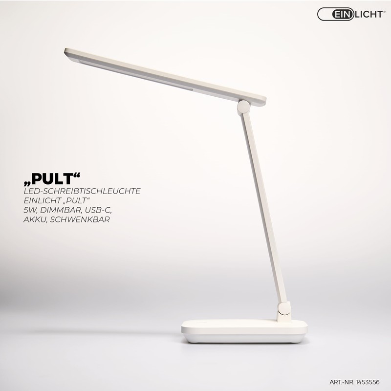 The Einlicht LED desk lamp "PULT" is the ideal solution for perfect light in any work situation. With its touch switch, it allows continuous dimming, while its two flexible swivel arms allow individual light alignment. Enjoy up to 6 hours of maximum brightness after only 4 hours charging time. With an output of 400 lumens in neutral white and a colour temperature of 4000 K, it creates a pleasant working atmosphere. Energy efficiency is ensured by a low power consumption of 5W, making it ideal for long working days.