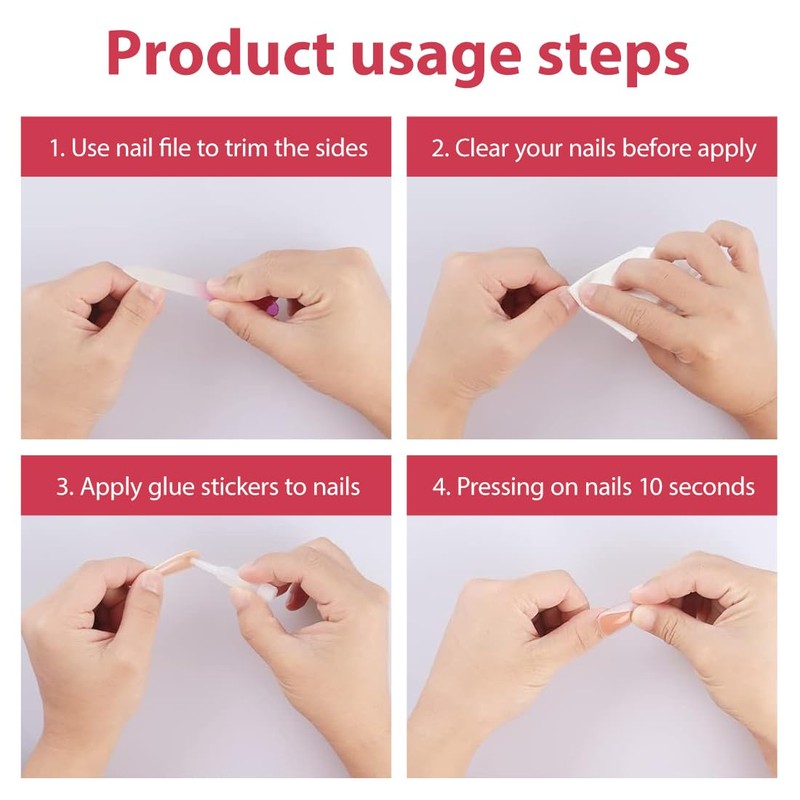 - Einfach zu verwenden: Reinigen Sie einfach Ihre Nägel, wählen Sie dann die richtige Nagelgröße, tragen Sie Kleber oder Gelee-Kleber auf Ihre Nägel auf und drücken Sie ihn an, und schon können Sie in wenigen Minuten professionelle Maniküre-Effekte erzielen.