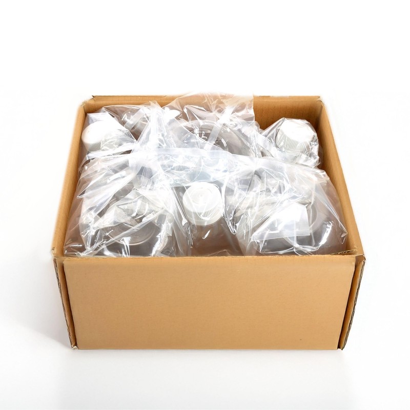 1L sterile polycarbonate Erlenmeyer flasks with vented caps, pack of 6. Flat bottom for stability, impact-resistant design, and gamma sterilized for lab applications. Ideal for cell culture, fermentation, and media prep.