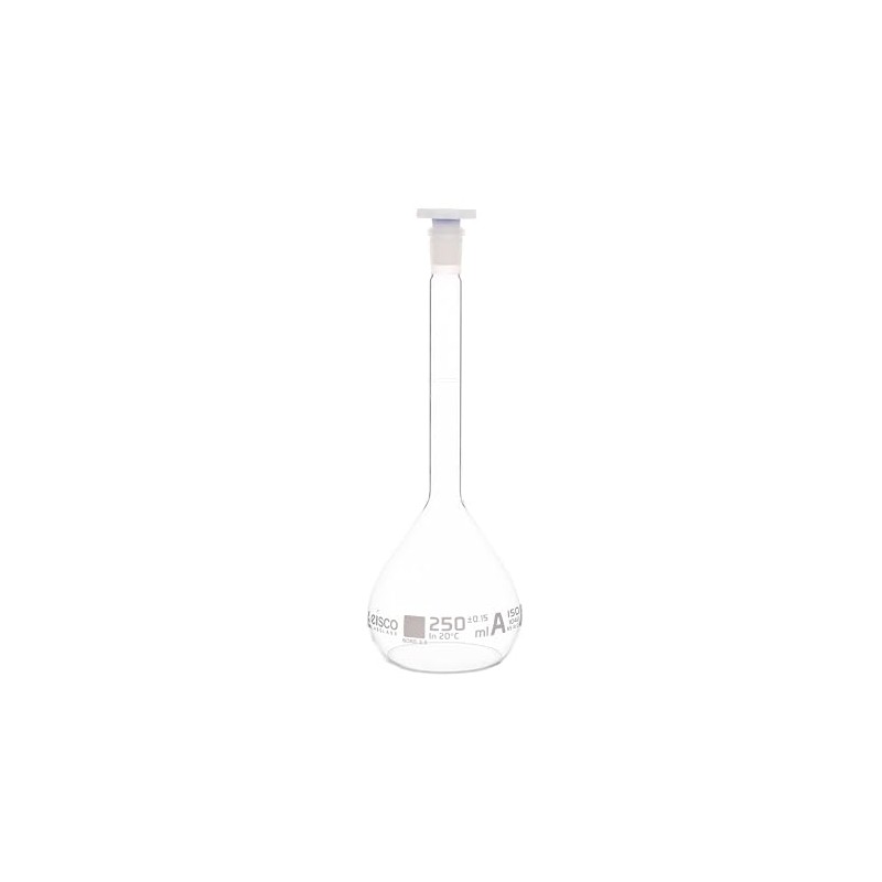 Volumetric flask made of high quality, heavy duty, 3.3 borosilicate glass. Class A tolerance.