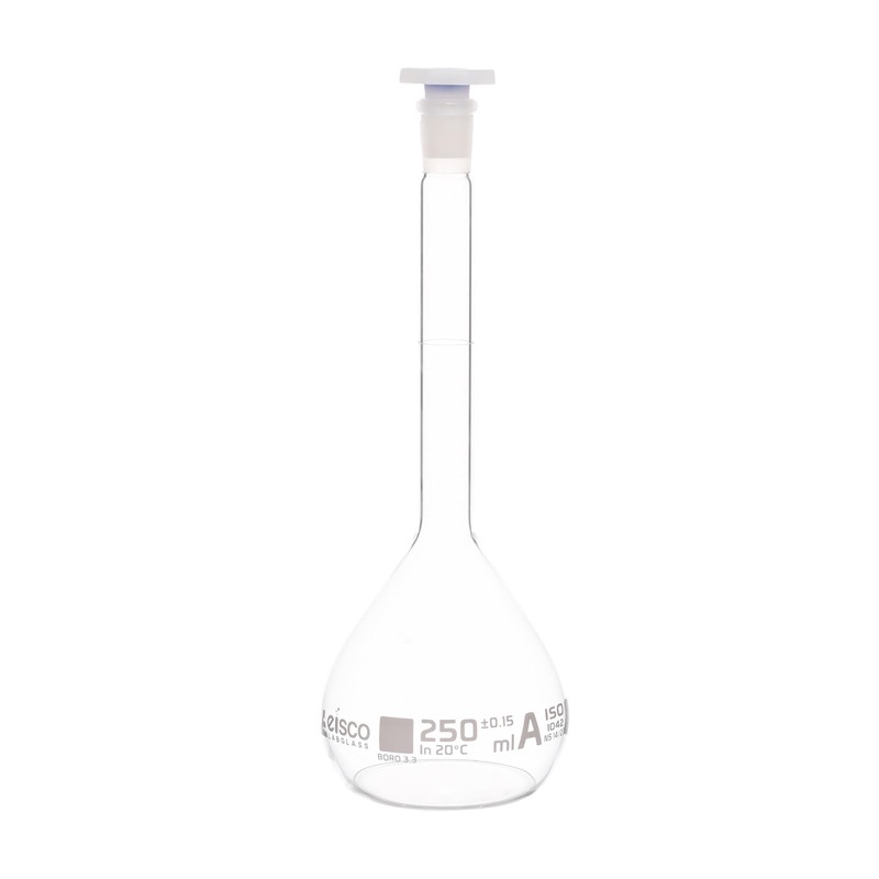 EISCO Volumetric Flask, 250ml - Class A 14/23 Polyethylene Stopper, Borosilicate Glass White Graduation, Tolerance ±0.150- Eisco Labs