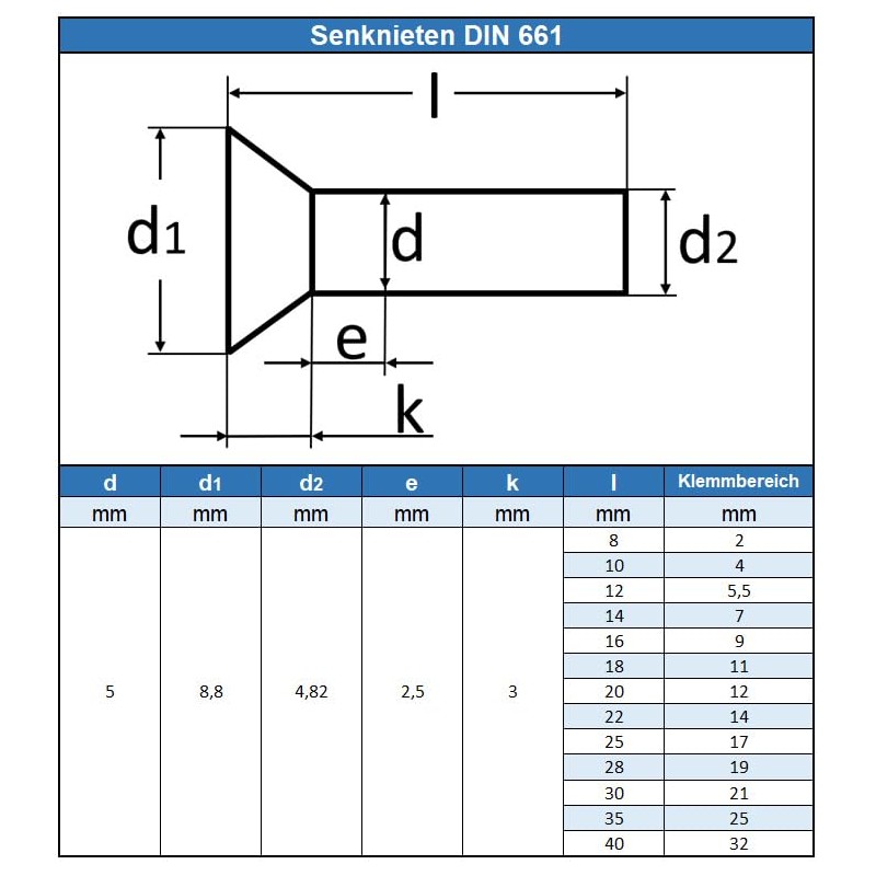 - For countersunk rivets, the length is indicated with the head. Largest of the clamping range can be found in the technical drawing in picture 2.