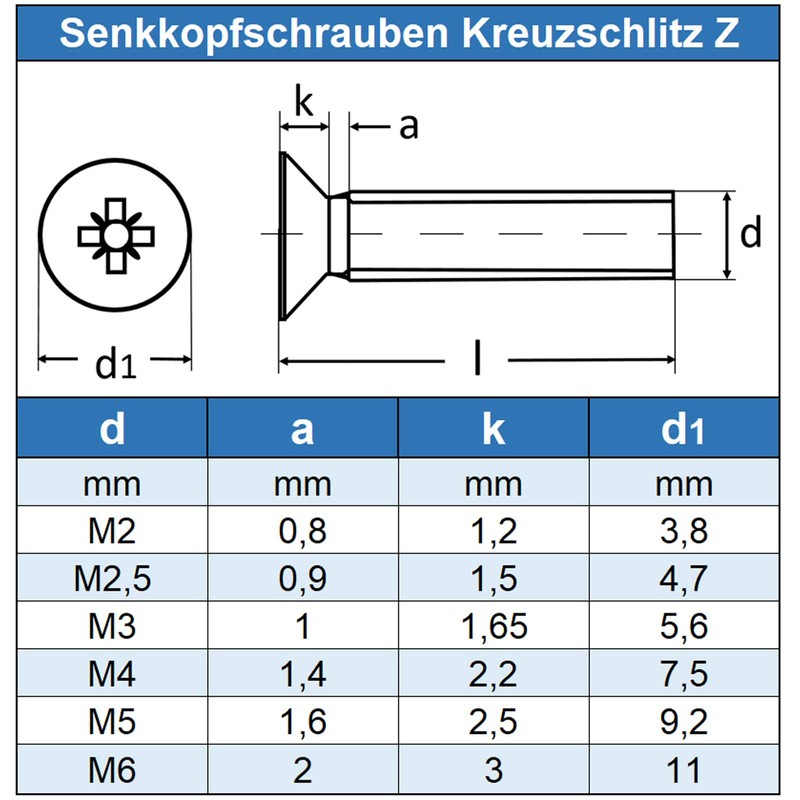 - For countersunk screws, the length is indicated with head. For further dimensions, please refer to the technical drawing in picture 2.