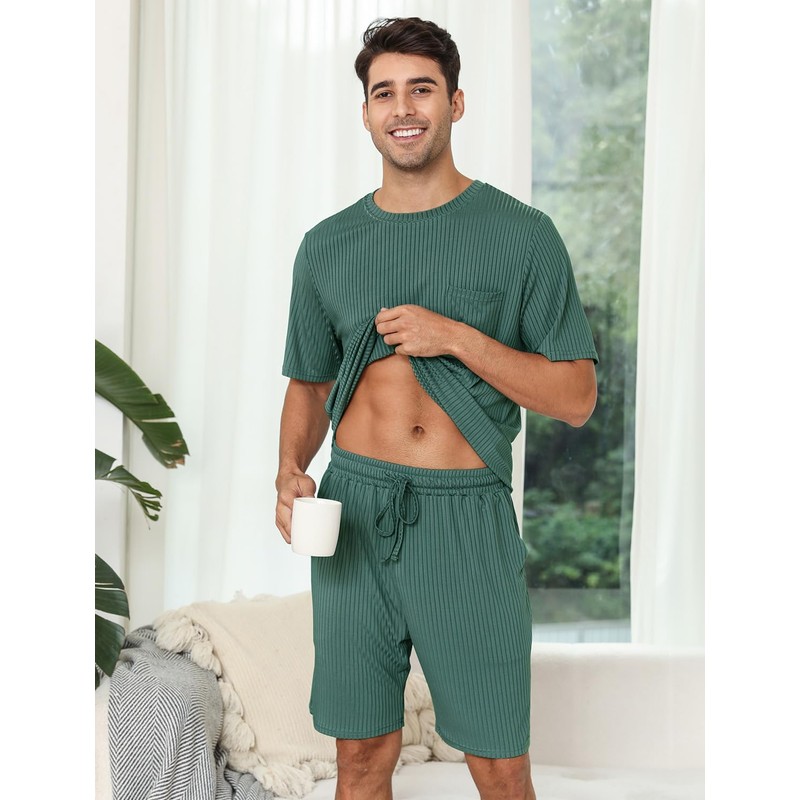 EISHOPEER Men's Lounge Wear Set with Round-Neck Top and Short Sleep Pajama Set - Comfortable Loungewear for Men Dark Green Medium