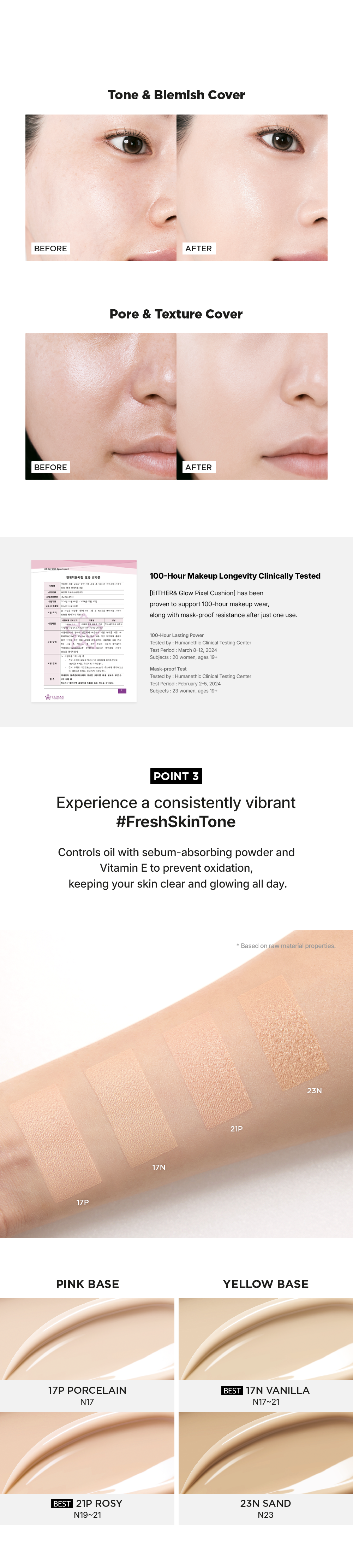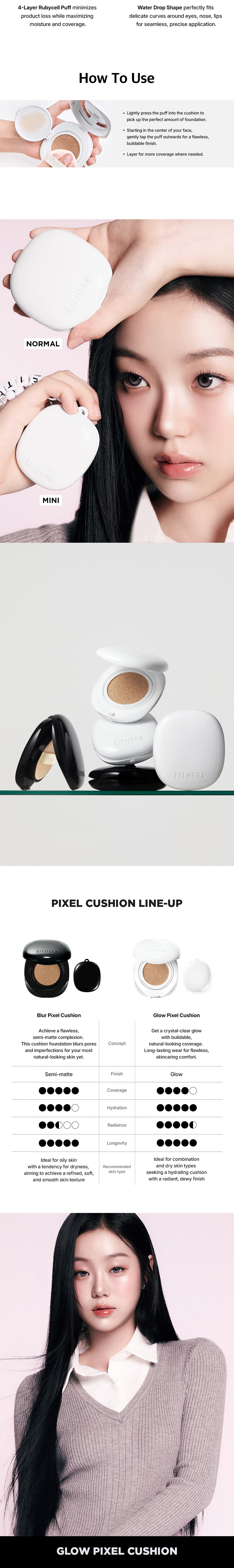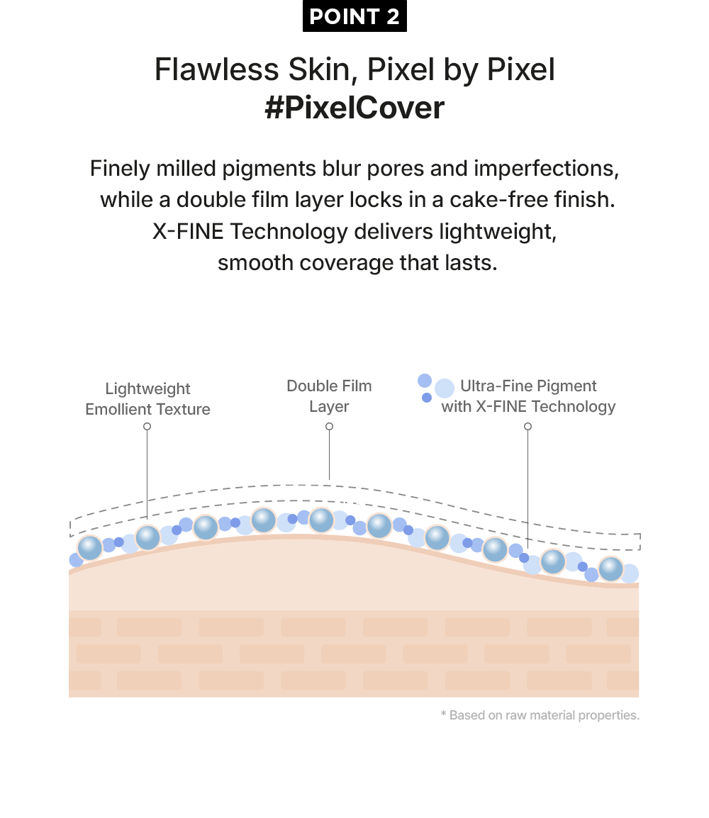 Finely milled pigment particles fill skin texture evenly, while a double film layer locks firmly onto the skin surface to keep makeup in place without caking or lifting. Dermatologically tested for primary irritation, ensuring safe daily use, and comes with a pixel puff for a smooth, flawless finish. Features a dense 4-layer rubycell puff that reduces formula from seeping inside, helping deliver moist, even coverage.
