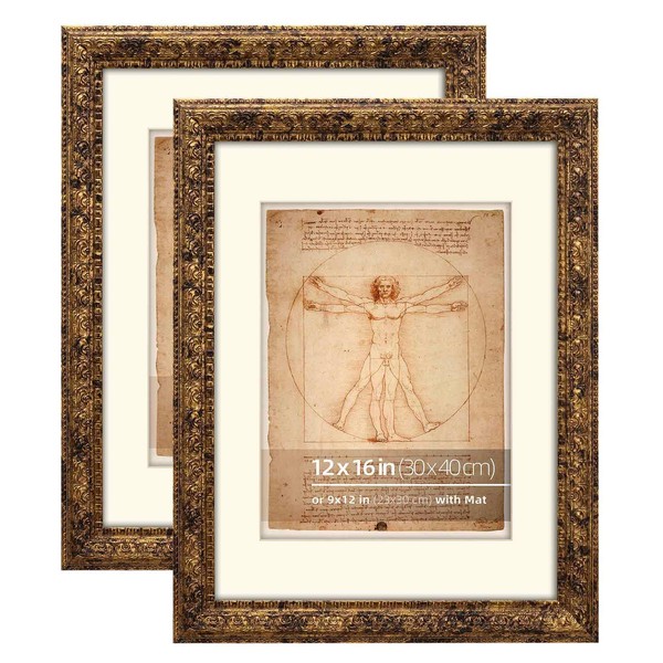 Eitida 12x16 inches Rustic Gold Ornate Picture Poster Frame, With Mat for 9x12 inches photos Vertical or Horizontal Display with Plexi glass Cover, 2 Pack