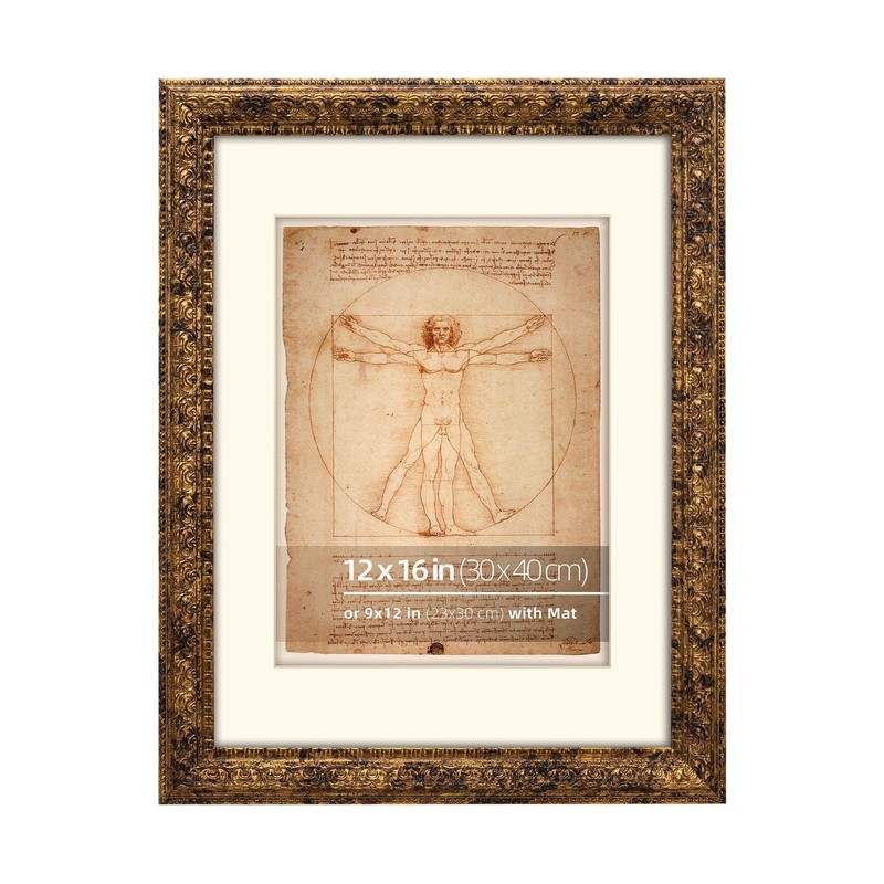 - The frame profile is made of recycled polystyrene, the gold foil is embellished with rustic design, fit in with a variety of surfaces, including walls, furniture, and cabinets. This 12x16 inches picture frame perfectly fits 12 x 16 inches photo without mat or 9x12 inches photo with mat. (Note: Actual mat opening size is: 8.5 x 11.5 in.).