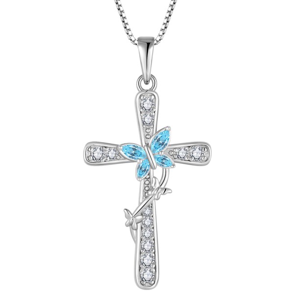 EJARY Cross Necklace for Women Butterfly 925 Sterling Silver March Birthstone Aquamarine Pendant Necklaces Religious Faith Cross Jewelry