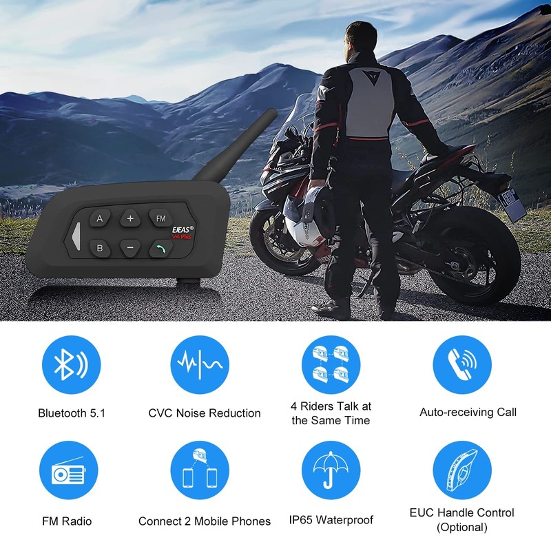 - [Wide Application]: EJEAS V4 Plus motorcycle communication system is suitable for most full-face helmets, half helmets and open helmets, and the installation is quite simple. It can be used together with our EUC remote control handle to keep your riding safe and comfortable.