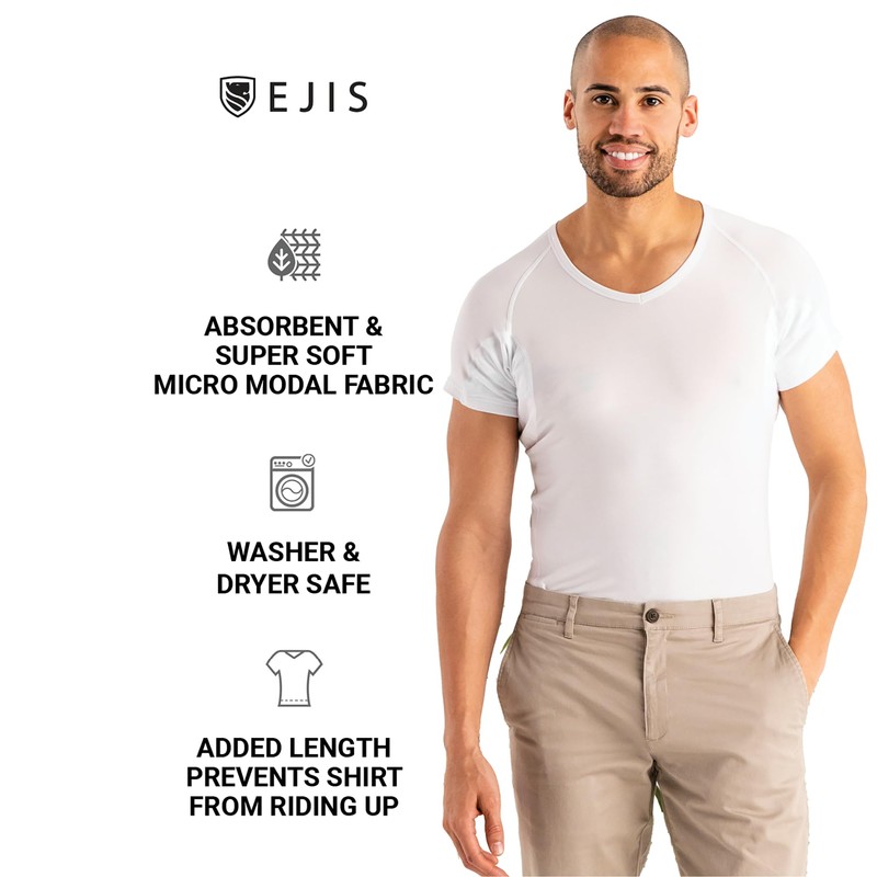 - THE EJIS SWEAT DEFENSE MICRO MODAL UNDERSHIRT: Forget ordinary cotton undershirts. Our premium Sweat Defense undershirt keeps your dress shirt bone dry and are 100% guaranteed to stop armpit sweat marks. With a combined 120 sq. inches of coverage in each sweat proof undershirt, you can think of it as your never fail backup to antiperspirant deodorant.