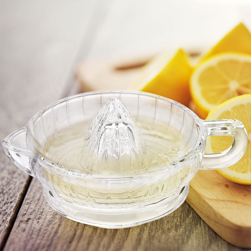 - Diseño de cristal: hecho de vidrio pesado y sin plomo para usar con todas las frutas cítricas. Este exprimidor de limón está diseñado con un mango y un pico vertedor para facilitar su uso. Además, el diseño del pico vertedor y su construcción estable hacen de este exprimidor de cítricos una herramienta de cocina esencial en su vida diaria.
