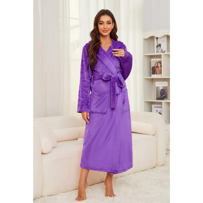 EK4YDNDS Womens Long Hooded Fleece Robe, Soft Warm Spa Bathrobe for Cozy Lightweight Loungewear(Violet, S/M)