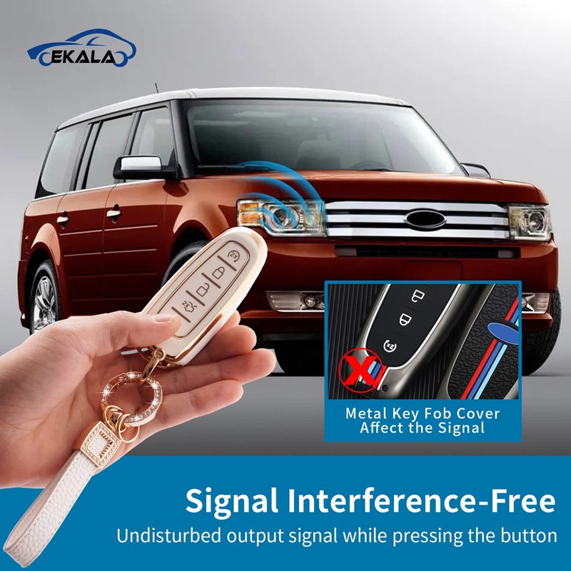 EKALA for Ford Key Fob Cover with Leather Key Fob Keychain, 5 Buttons Soft TPU Keys Shells White Key Fob Cover Compatible with Ford Edge Focus Flex Explorer Taurus Lincoln MKS MKT MKX(P-Frd-5L)