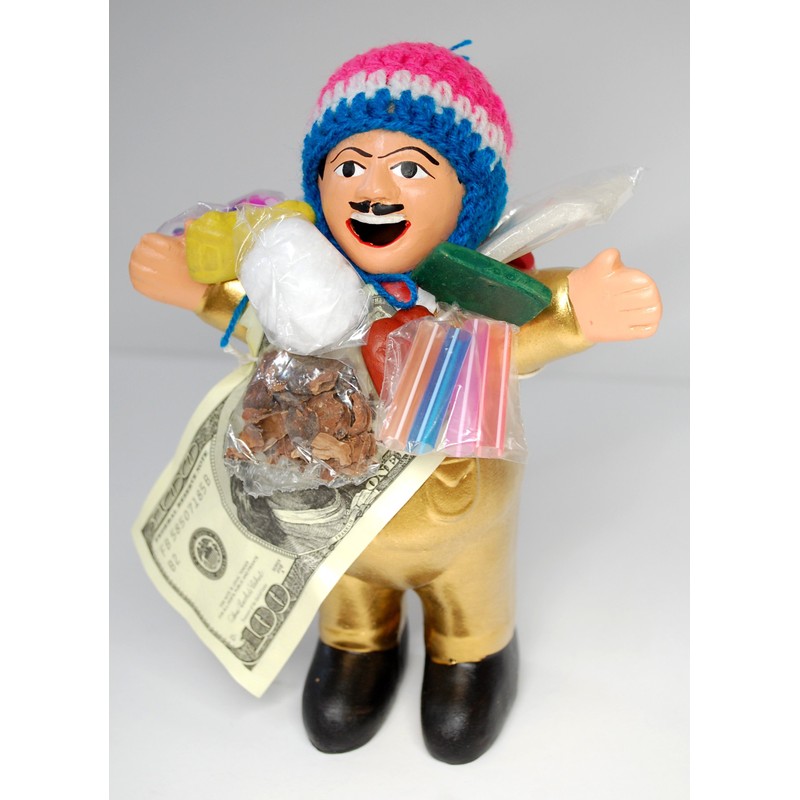 Ekeko Doll 7.5 inches (19 cm) GOL; Large Size Huayuluro Fruit Present! Large Size Ekeko Doll 7.5 inches (19 cm), Gold/Gold [Our Vivas Latin Shop Original Model] Made in Peru (Direct Import from Peru)