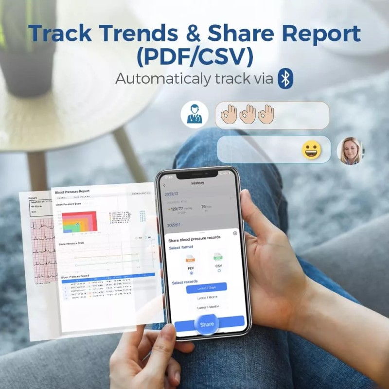 The intuitivist way to present key indicators1. Real-time data tracking A real-time dynamic blood pressure data will be presented in the APP interface. The data will be automatically analysed for you after the measurement is completed, providing you with a reference. 2. Large horizontal display Historical data on the data page can be viewed in full screen by clicking on it for a better visual effect. Each piece of data can be zoomed in or out to view a time period of data. 3. Share Report Share your daily blood pressure report with your doctor or family and friends. Also you can share for 7 days, 1 month, 3 months blood pressure reports in PDF/CVS format. The blood pressure data can be synced to Apple Health. | ||