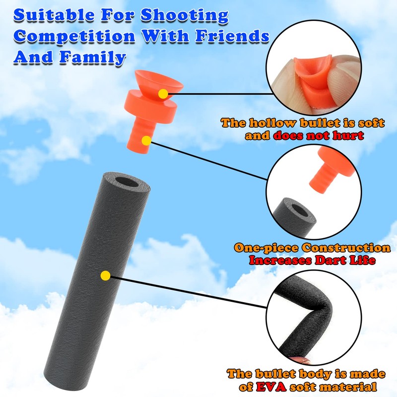 - Comparado con otros dardos de succión, el diseño mejorado de la punta de succión tiene un alcance más largo sin afectar la potencia de succión. (Consejo: Hay polvo protector en la cabeza de la ventosa que evita que envejezca y se endurezca durante el transporte y almacenamiento. Por favor, lávelo con agua limpia antes del primer uso.)