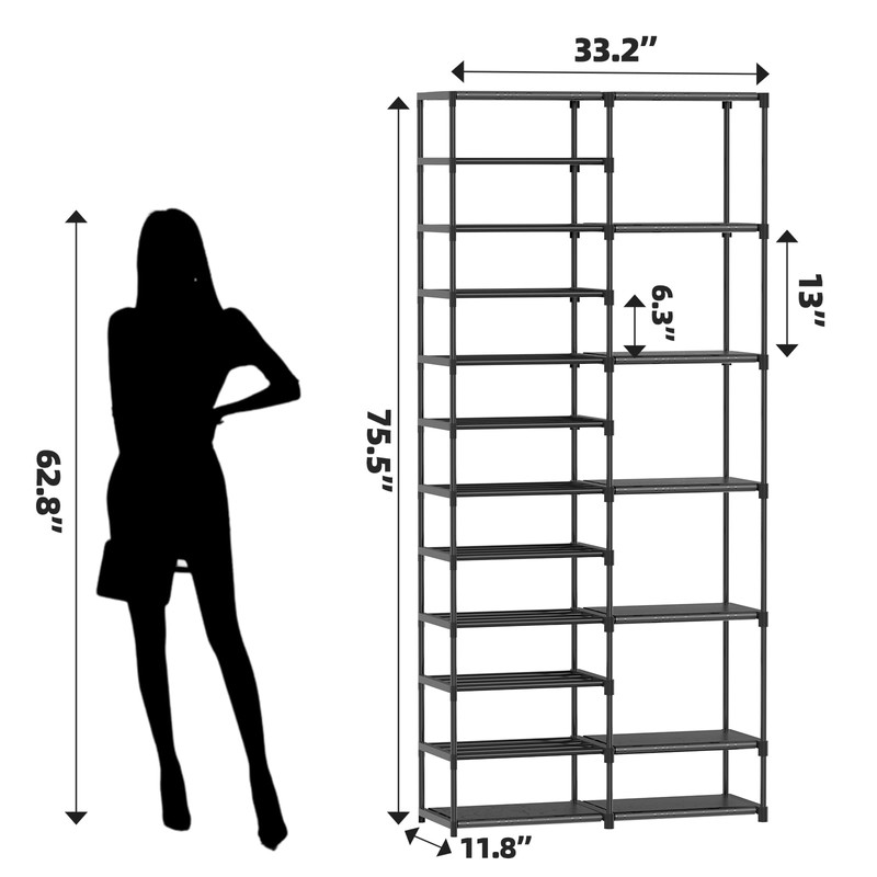 • 1-Large Capacity 12 Tier Shoe Rack: Size: 33.2 inches L x 11.8 inches W x 75.5 inches H, can easily hold 34-48 pairs of shoes. The shoe rack organizer is designed with different heights to perfectly fit boots, heels, shoe boxes, bags or other larger accessories to meet your various needs.