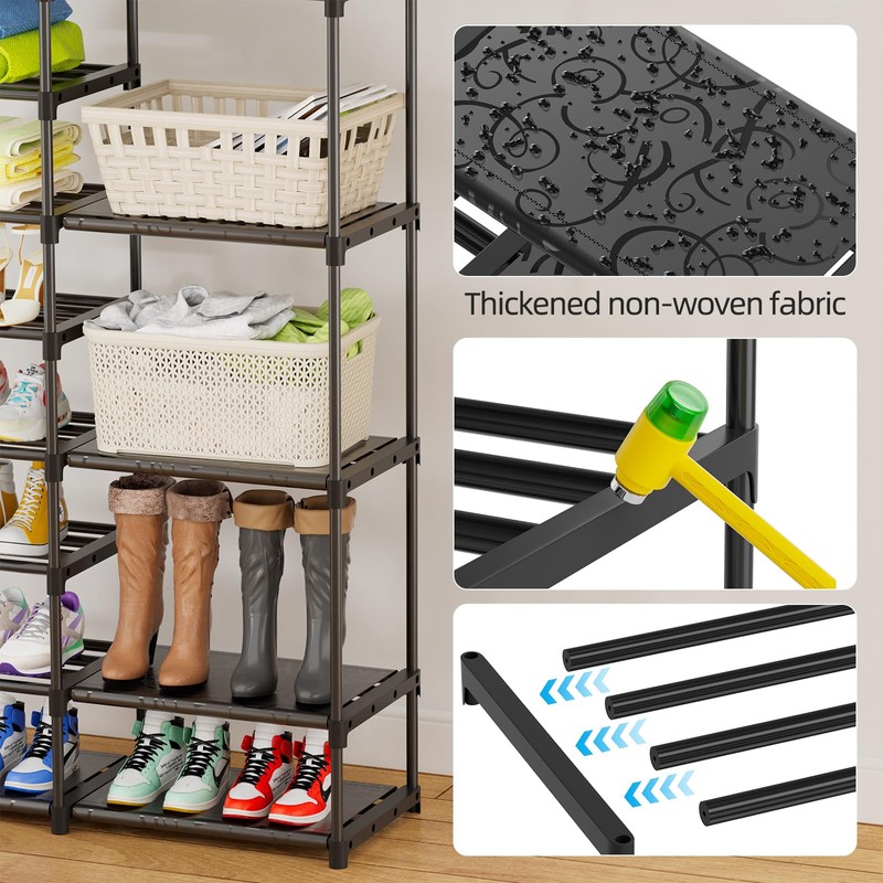 • 2-Sturdy Material & Compact Structure: The shoe rack is made of durable waterproof non-woven layers, reinforced plastic connectors, and thickened iron tubes to make it more durable for daily use. Supporting up to 22 pounds per tier, the shoe rack has a strong carrying capacity.