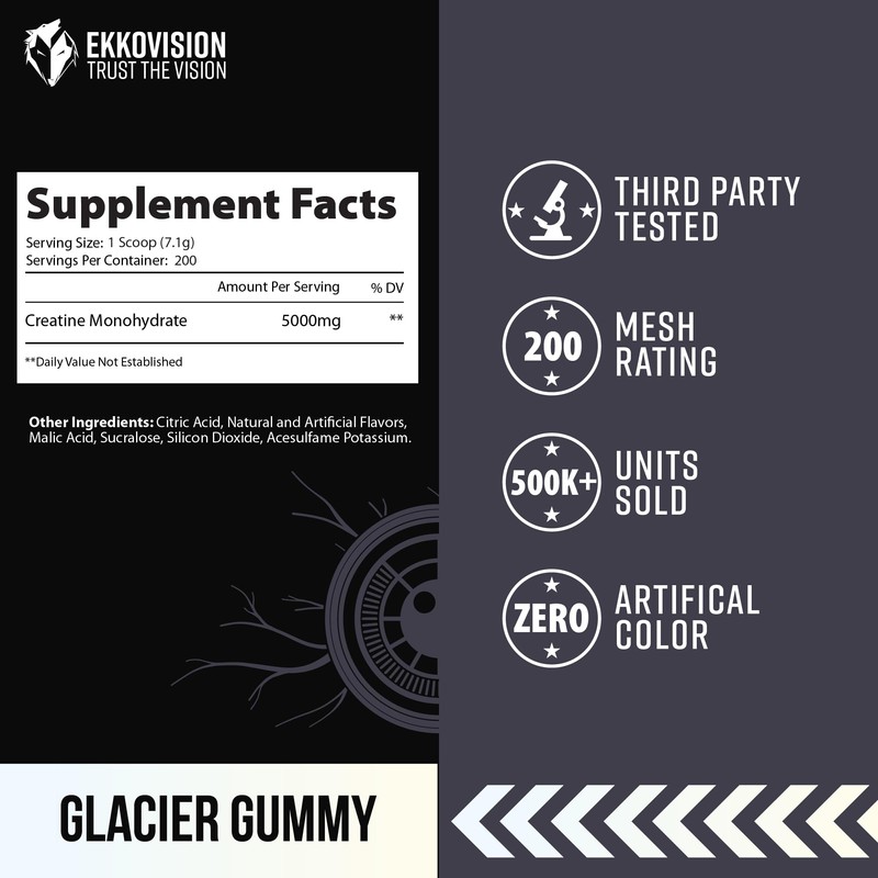 Ekkovision Creatine Monohydrate Powder, Micronized, Glacier Gummy, Pre Workout & Post Workout Supplement for Men & Women, Energy Support, Easy to Mix in Shakes, Smoothies & Beverages, 200 Servings
