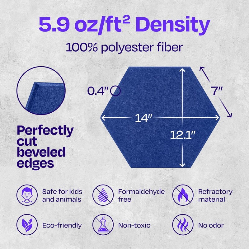 - SUPERIOR NOISE REDUCTION PANELS: Each soundproofing panel is precisely cut of high-density, 5.9oz/ft^2 (1800gr/m^2) poly-fiber panels. Our sound proofing padding for wall reach a NRC rating of up to 0.95, making a big difference to the sounds we hear around us. Pick these hexagon acoustic panels over the old acoustic foam panels and create a beautiful room with superior sound quality.