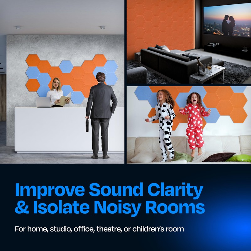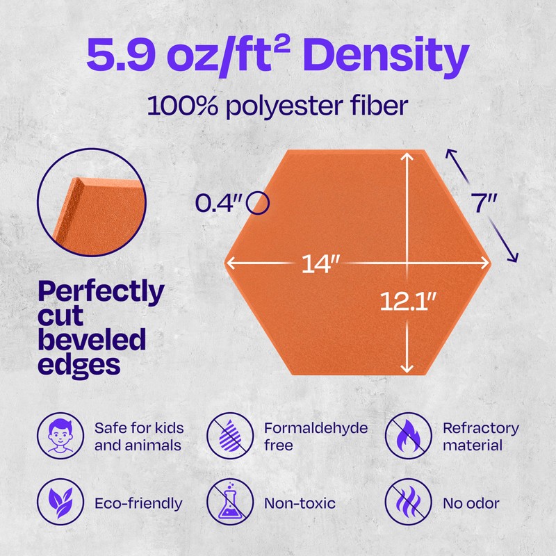 - SUPERIOR NOISE REDUCTION PANELS: Each soundproofing panel is precisely cut of high-density, 5.9oz/ft^2 (1800gr/m^2) poly-fiber panels. Our sound proofing padding for wall reach a NRC rating of up to 0.95, making a big difference to the sounds we hear around us. Pick these hexagon acoustic panels over the old acoustic foam panels and create a beautiful room with superior sound quality.