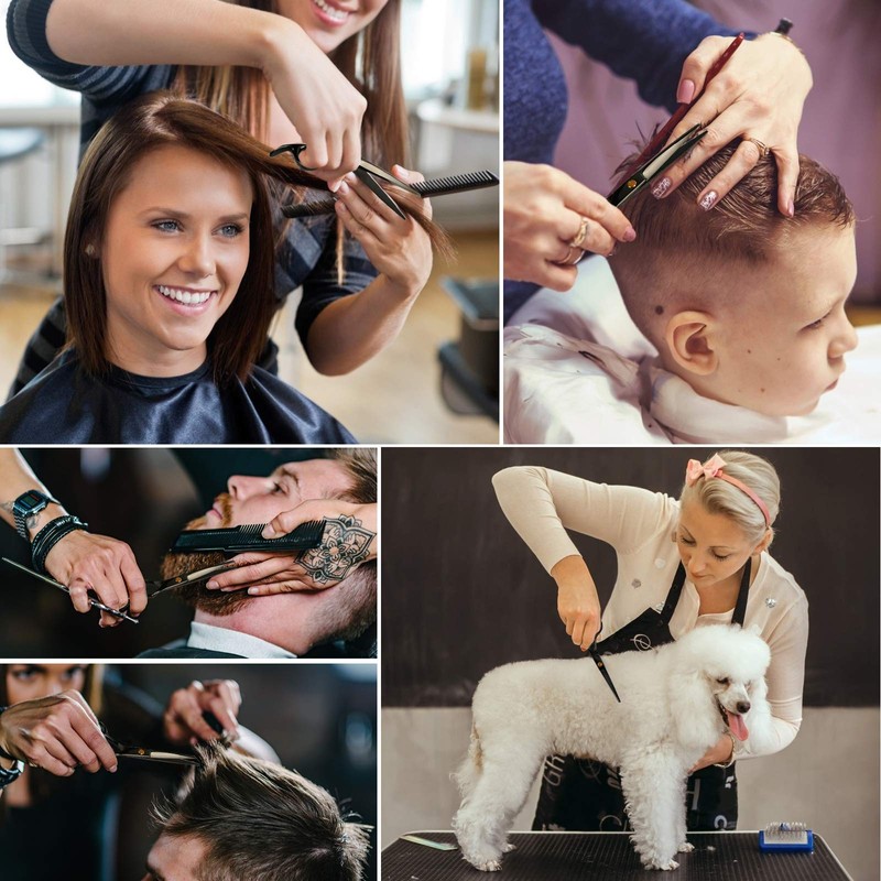 - Wide application haircuts scissors: hairdressing scissors are suitable for home use and professional use. Suitable for pets, children, women and men. Hair scissors and a protective black case for professional use. In many hairdressing salons, the scissors can also be used as beard scissors.