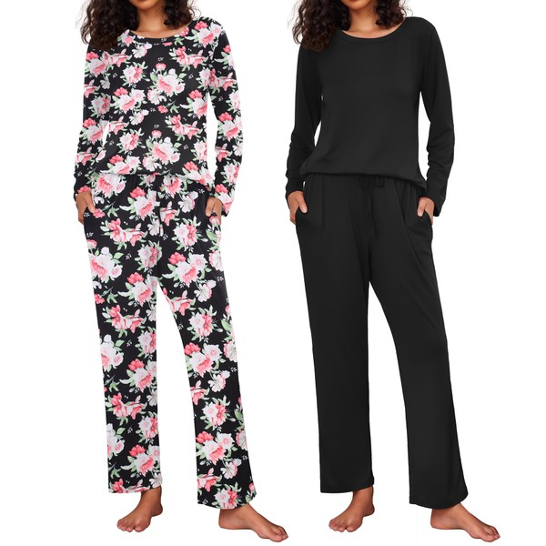 Ekouaer 2 Pack Women's Pajama Set Soft Long Sleeve Sleepwear Loungewear Pjs Sets with Pockets,XX-Large