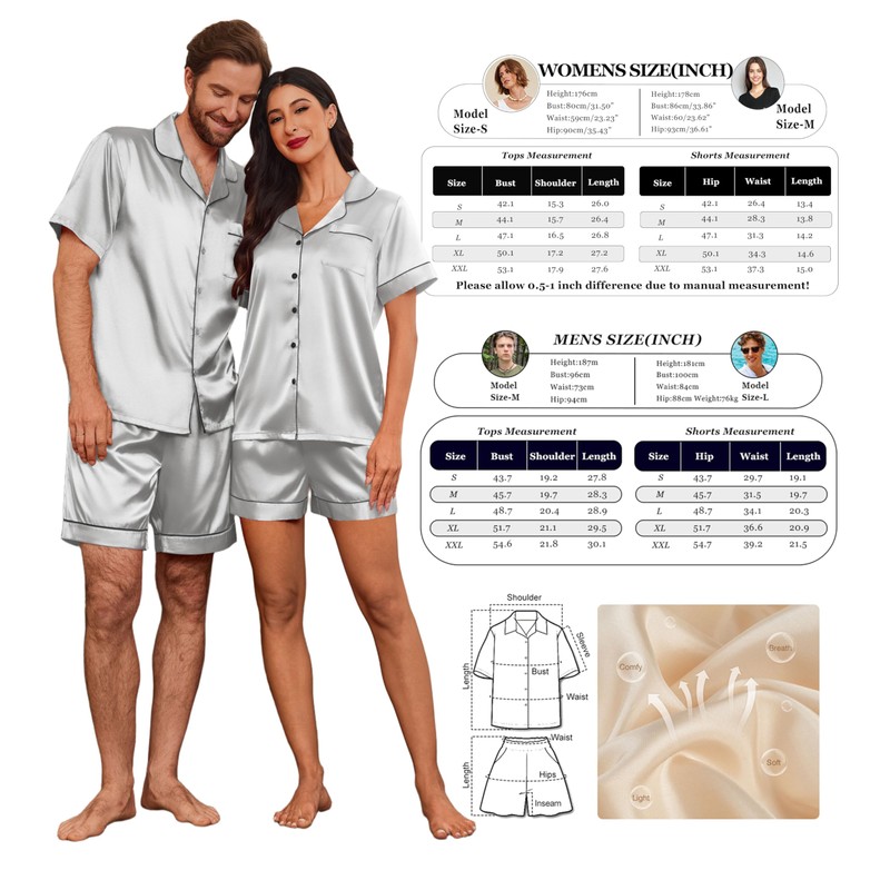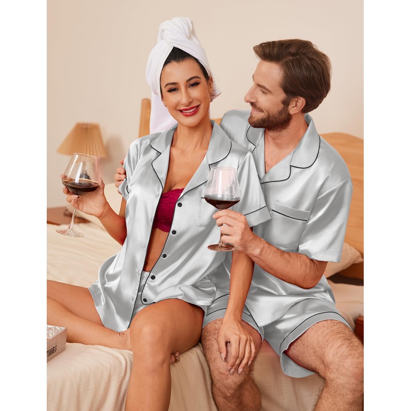 Ekouaer Couples Silk-Satin Pajama Set | Summer Sleepwear & Versatile Lounge OutfitCrafted from premium lightweight silk-satin (95% polyester, 5% spandex), this breathable 2-piece pajama set mimics the luxurious feel of mulberry silk, offering unparalleled softness for all-night comfort. The relaxed short-sleeve button-down top and coordinating lounge shorts blend effortless style with functionality, designed to keep you cool during hot summer nights.Key Features:Top: Relaxed-fit short-sleeve shirt with a classic notch collar, front button closure, and practical chest pocket for a polished yet casual look.Bottoms: Elastic-waist shorts with a universal fit, ensuring comfort for all body types while maintaining a chic silhouette.Multipurpose Wear: Transition seamlessly from bedtime to daytime—pair the top with jeans for brunch, or style the set as loungewear for lazy weekends. Machine-washable fabric retains its silky texture even after repeated washes (max 40°C/104°F).Versatile Occasions:Ideal for sleepovers, bridal parties, vacations, or cozy nights in. The timeless design doubles as office-casual attire when layered under blazers or paired with trousers.Gift-Ready Luxury:Premium packaging and a universally flattering design make this set a thoughtful gift for birthdays, Valentine’s Day, holidays, or "just because" moments. Available in sizes S–XXL (1–2 cm variance may apply; see size chart in inches/cm).
