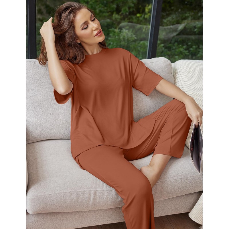 Ekouaer Lounge Sets for Women Short Sleeve Tops and Long Pants Soft Comfy Pajamas Set 2 Piece Outfits,Camel,L