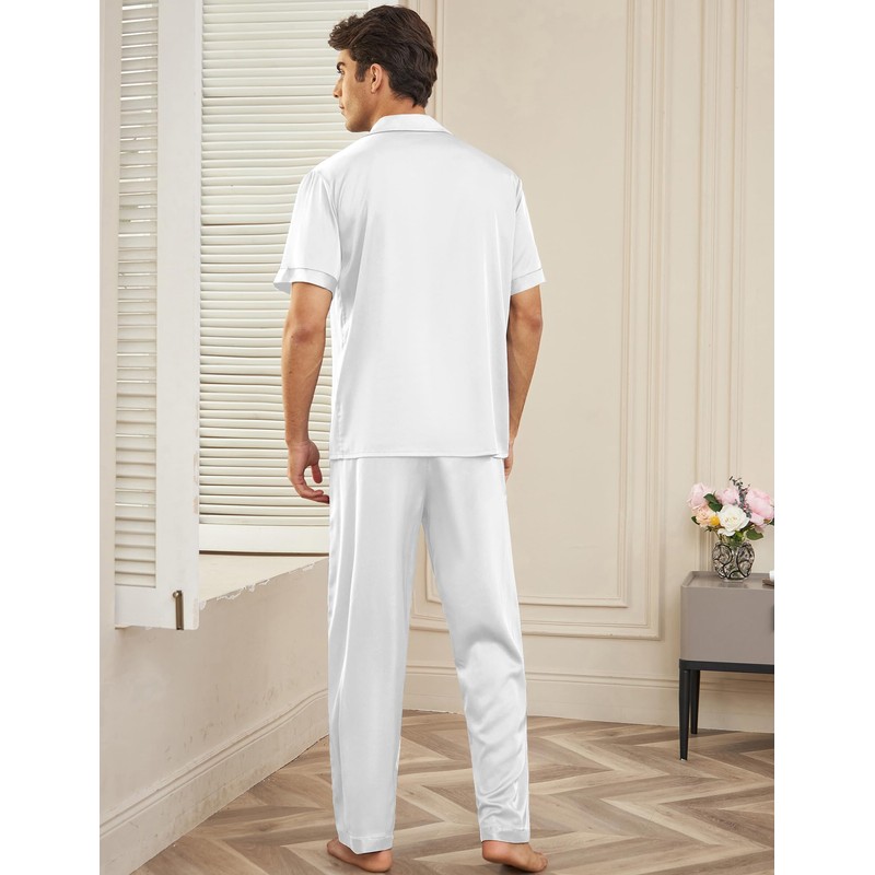 - Short Sleeve Tops: This satin silk pajamas set feature a full button down front that is easy to get on and off. Lightweight and Skin-friendly silk pajamas for men.Great for sleeping, casual wear, or lounging around the house or yard all day