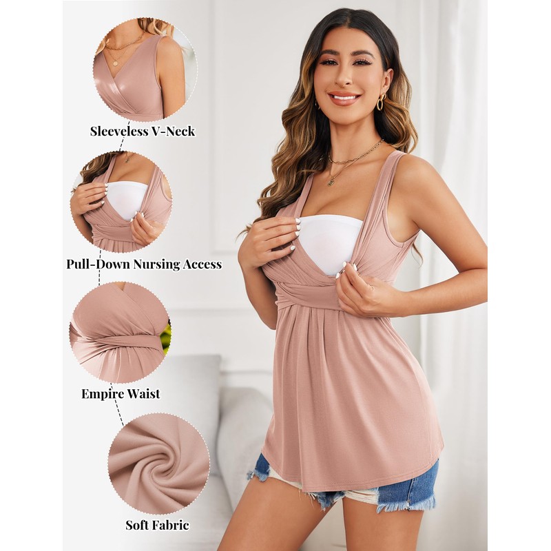 - 【Design】Stylish sleeveless maternity tops, v neck pull-down nursing access, empire waist, flowing hemline, stylish t-shirt of three packs. Middle empire waist belt and flowing hemline make you looks more stylish, it also has a lot of room for your baby bump belly. These casual nursing tanks are a style staple for mom-to-be.
