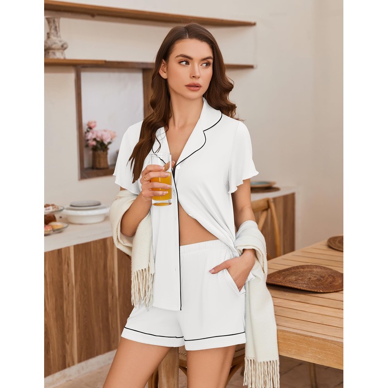 - 【Thoughtful Design】This women's pajama set features a short sleeve button-down top that falls at the hip, with a stylish notch collar. The shorts come with an adjustable drawstring elastic waistband for a custom fit, plus two convenient side pockets for small essentials.