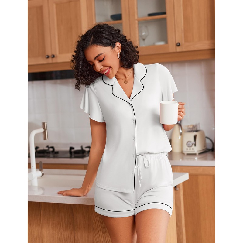 Ekouaer Pajamas for Women Set Button Up Pjs Ruffle Sleeve Sleepwear Notch Collar Bride Soft Pj Lounge Sets White L