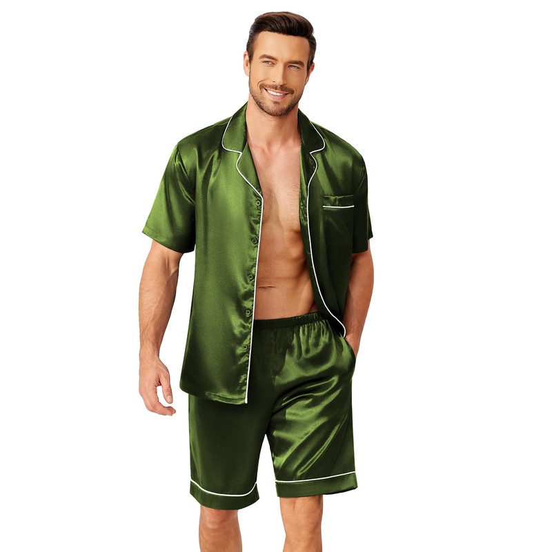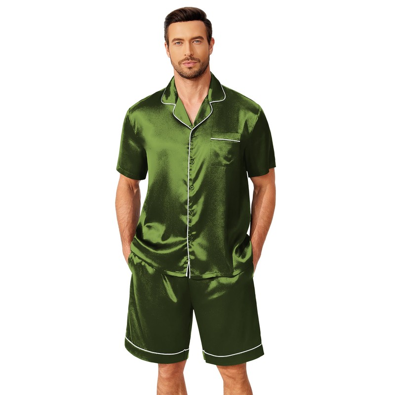Ekouaer Couples Silk-Satin Pajama Set | Summer Sleepwear & Versatile Lounge OutfitCrafted from premium lightweight silk-satin (95% polyester, 5% spandex), this breathable 2-piece pajama set mimics the luxurious feel of mulberry silk, offering unparalleled softness for all-night comfort. The relaxed short-sleeve button-down top and coordinating lounge shorts blend effortless style with functionality, designed to keep you cool during hot summer nights.Key Features:Top: Relaxed-fit short-sleeve shirt with a classic notch collar, front button closure, and practical chest pocket for a polished yet casual look.Bottoms: Elastic-waist shorts with a universal fit, ensuring comfort for all body types while maintaining a chic silhouette.Multipurpose Wear: Transition seamlessly from bedtime to daytime—pair the top with jeans for brunch, or style the set as loungewear for lazy weekends. Machine-washable fabric retains its silky texture even after repeated washes (max 40°C/104°F).Versatile Occasions:Ideal for sleepovers, bridal parties, vacations, or cozy nights in. The timeless design doubles as office-casual attire when layered under blazers or paired with trousers.Gift-Ready Luxury:Premium packaging and a universally flattering design make this set a thoughtful gift for birthdays, Valentine’s Day, holidays, or "just because" moments. Available in sizes S–XXL (1–2 cm variance may apply; see size chart in inches/cm).