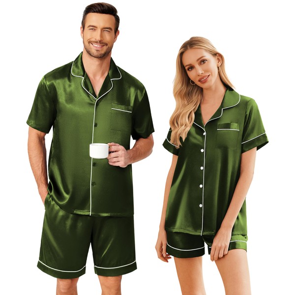 Ekouaer Satin Matching Pajamas Sets Couple Silk Button Down Sleepwear Women & Men Short Sleeve Pjs Lounge Set Dark Army Green,M