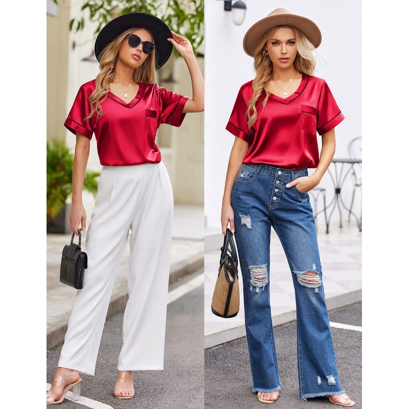 - Short Sleeve Top: V neck, soild color, smooth satin top with chest pocket. The loose cut can show your body curve while giving you a burden-free wearing experience