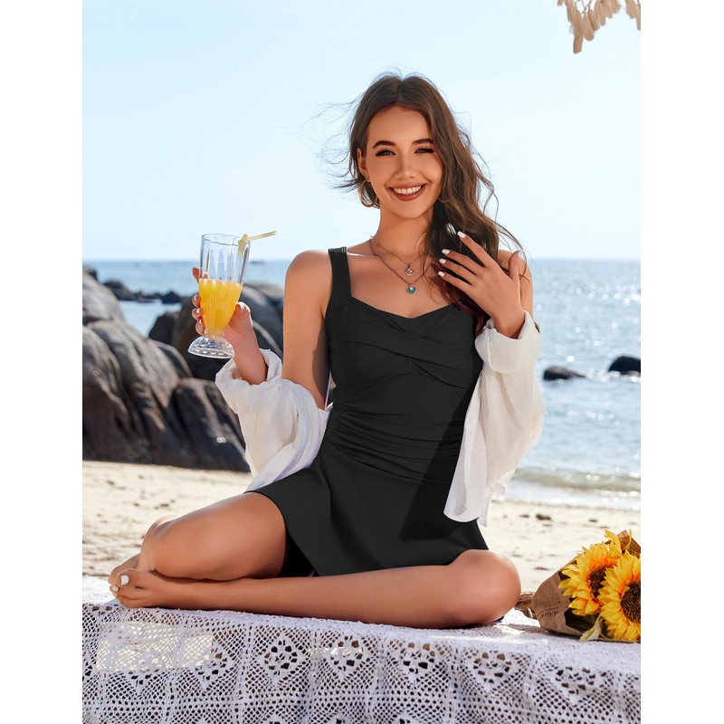 - Special Design -- One Piece swimsuit with a built-in bottom, cami swimdress with removable padding soft cup,this design good coverage all over. Does not ride up or creep and is comfortable to be active in.