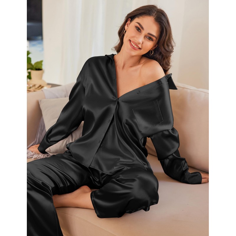Ekouaer Womens 2 Piece Silk Satin Pajama Set Long Sleeve Lounge Sets Button Down Shirts and Pants PJs Soft Sleepwear Sets Black XXL