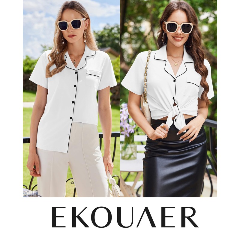 Ekouaer Womens Cotton Pajamas Set Classic Short Sleeve Pjs Set Soft Button Down Sleepwear Loungewear,Medium,White