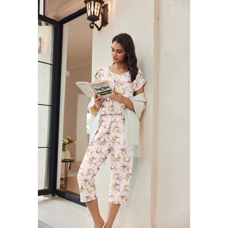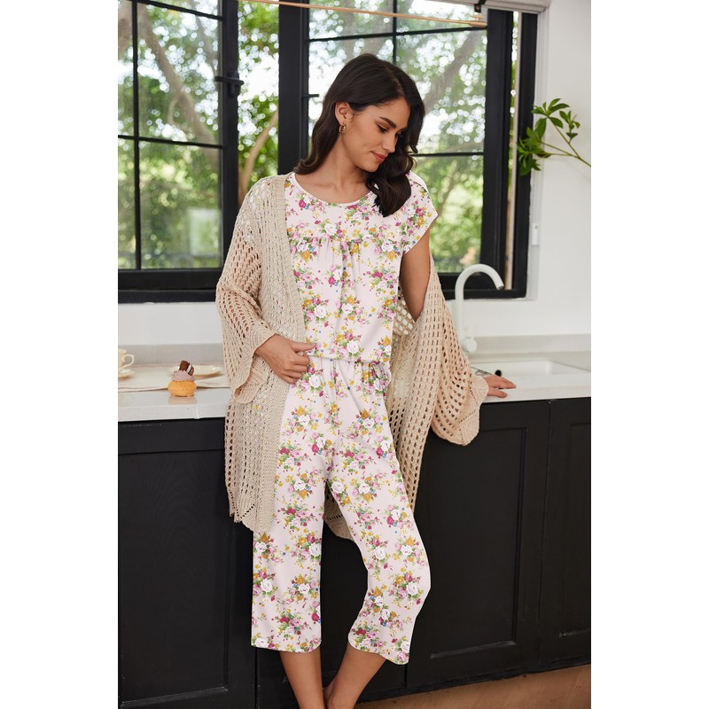 Ekouaer Womens Pajama Set Short Sleeve Sleepwear Pleated Floral Pjs Set Capri Pants Lounge Sets with Pockets S-XXL Apricot Flowers Medium